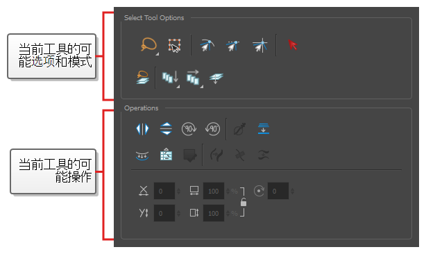例如,如果选择“Select”(选择)工具,则“Tool Properties”(工具属性)视图将显示与选择工具相关的选项及操作,例如“贴靠至轮廓”、“应用于所有绘图”、“水平翻转”和“拼合”。