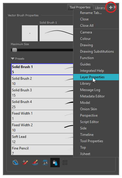 “Library”(文件库)视图用于存储诸如动画、绘图、背景和角色模型之类的元素,以便在不同场景和项目中复用。 还可以使用“Library”(文件库)视图来创建和存储元件,以及存储和导入图像和声音文件