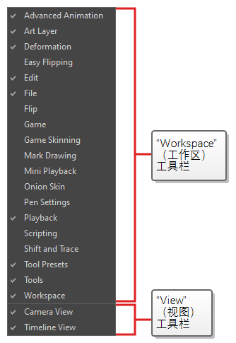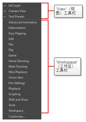• “Workspace”(工作区)工具栏为常规用途工具栏。 例如,顶部的“File”(文件)、“Edit”(编辑)、“Workspace”(工作区)、“Advanced Animation”(高级动画)和“Deformation”(变形)工具栏以及左侧的“Tools”(工具)工具栏都属于工作区工具栏。 这些工具栏可以放置在应用窗口的上、下、左、右侧。 也可以按照偏好放置在具体视图边缘。