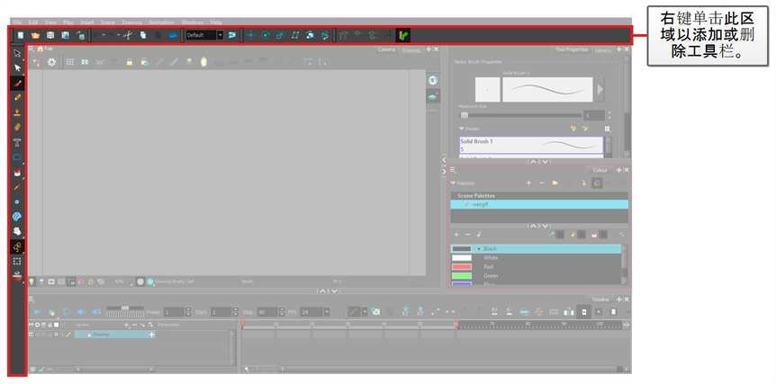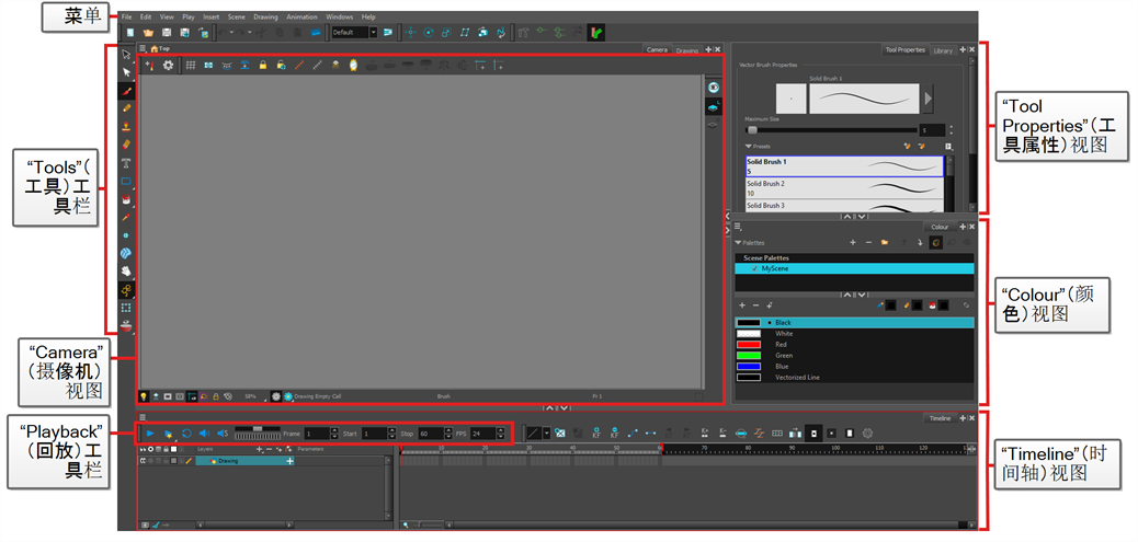 首先熟悉 Toon Boom Harmony Advanced 的用户界面后,使用起来会容易得多。 以下章节将对用户界面的最重要元素进行基本介绍。 阅读接下来的章节时,您将能了解有关用户界面中每个元素的更多详细信息。