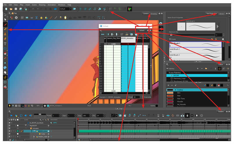 与“Timeline”(时间轴)视图相反,“Xsheet”(摄影表)视图不显示定位钉、特效或图层层级。 因此,它最适合传统无纸化动画,而“Timeline”(时间轴)视图则最适合数字动画或 cut-out 动画。