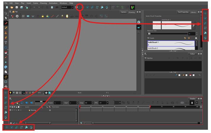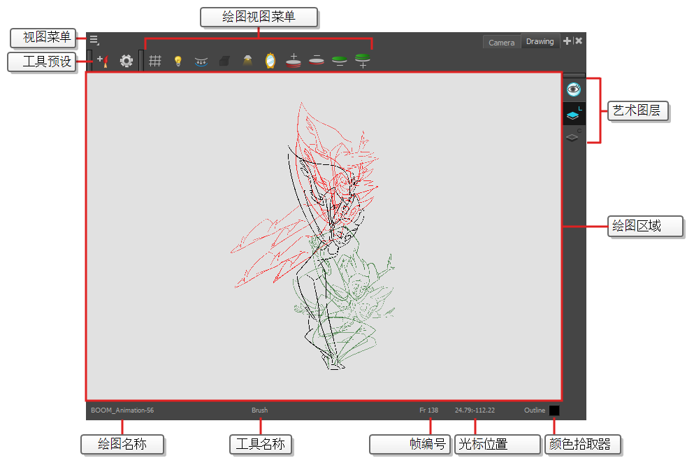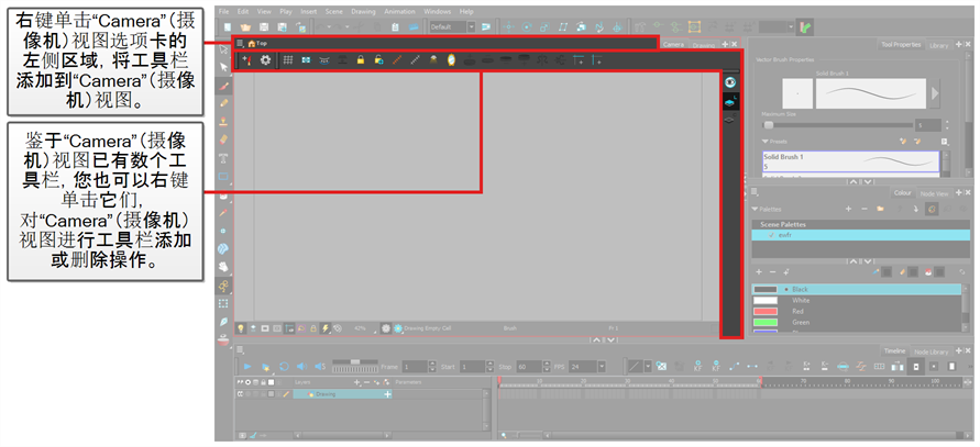Harmony 中,您可以在“Drawing”(绘图)或“Camera”(摄像机)视图中绘制图案。 虽然两个视图相似,但是在绘图方面有一些差异。