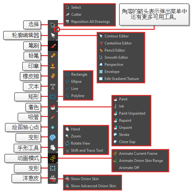 “Tools”(工具)工具栏中,部分按钮的右下角有一个三角形。 表示此按钮堆叠了数种工具。 若要使用这些工具,可以单击或按住工具按钮,或者选择工具,然后再次单击。