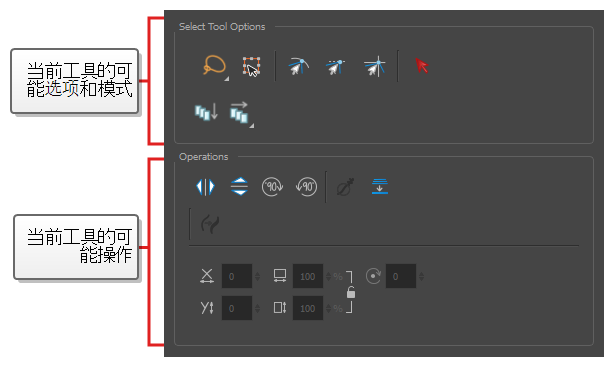 例如,如果选择“Select”(选择)工具,则“Tool Properties”(工具属性)视图将显示与选择工具相关的选项及操作,例如“贴靠至轮廓”、“应用于所有绘图”、“水平翻转”和“拼合”。