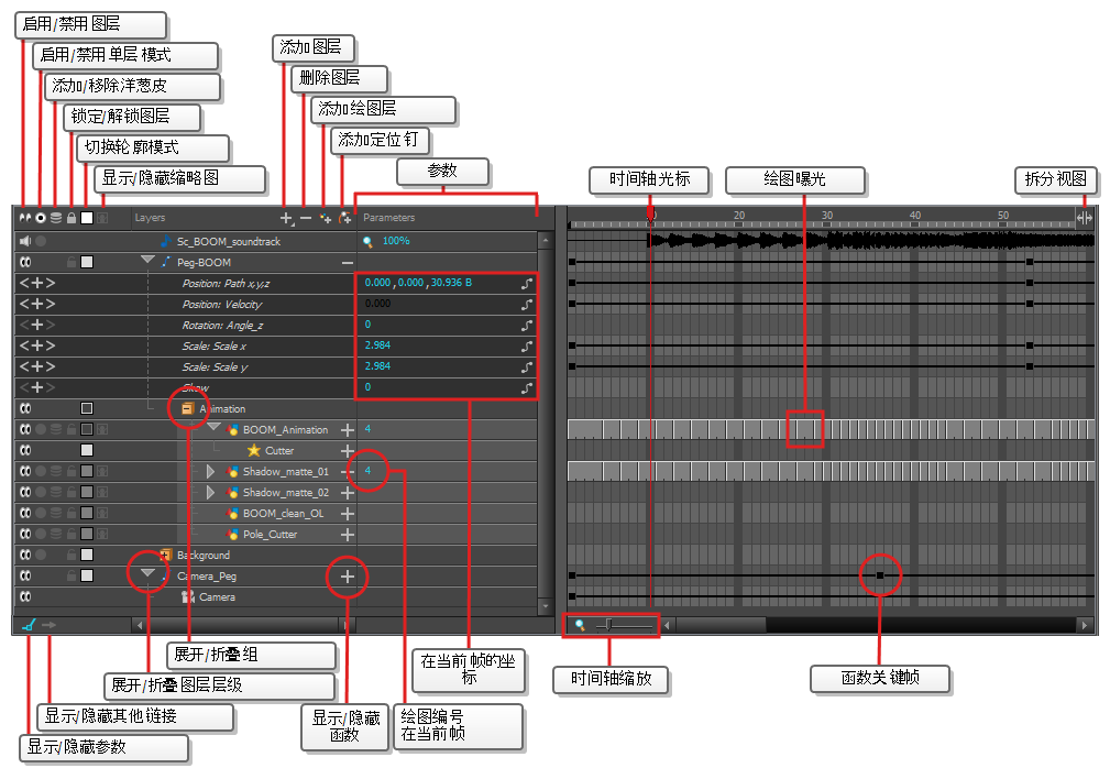 “Timeline”(时间轴)视图是调整绘图时间、添加关键帧和对图层排序时使用的主要视图。 “Timeline”(时间轴)视图显示图层、特效、声音、关键帧值、场景长度、图层名称、绘图、关键帧、时间和帧。
