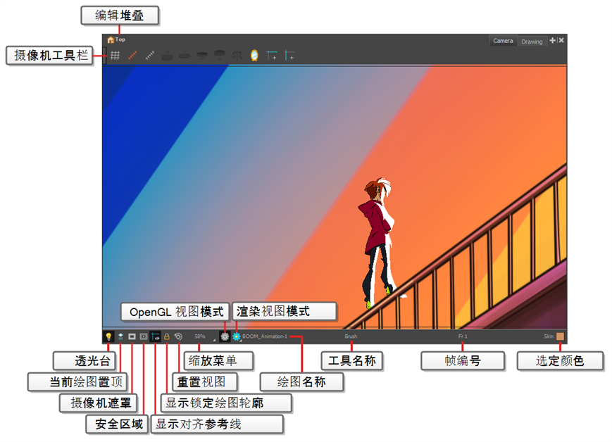 “Camera”(摄像机)视图是 Harmony 的操作中心。 在此视图中,可以进行绘制、着色、生成动画、设置场景、操纵对象、打开元件和预览动画。