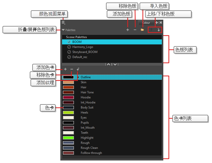 可以在“Colour”(颜色)视图中创建颜色和色板,并将现有色板导入到项目中。 绘图、着色和创建颜色风格时也需要使用“Colour”(颜色)视图。