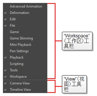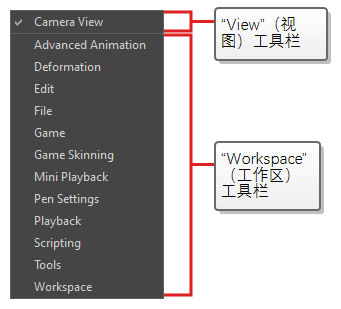 • “Workspace”(工作区)工具栏为常规用途工具栏。 例如,“File”(文件)、“Edit”(编辑)、“Workspace”(工作区)和“Deformation”(变形)工具栏以及左侧的“Tools”(工具)工具栏都属于工作区工具栏。 这些工具栏可以放置在应用窗口的上、下、左、右侧。 也可以按照偏好放置在具体视图边缘。