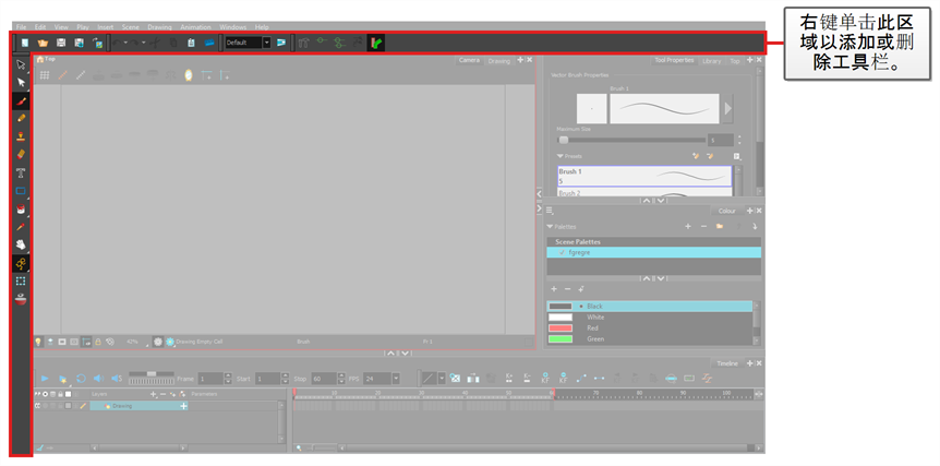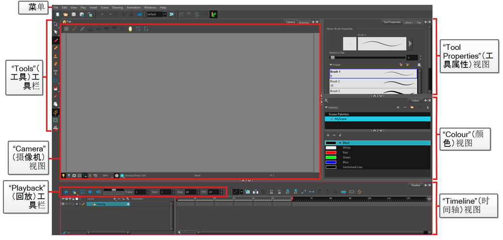 首次启动 Toon Boom Harmony Essentials 时,显示默认工作区。 工作区分隔为称作视图的矩形用户界面,每个视图均有其特定用途。 用户界面的顶部和左侧以及部分视图还包含工具栏,每个工具栏也有特定功能。