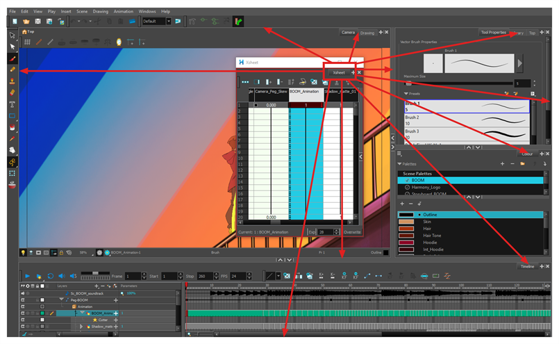与“Timeline”(时间轴)视图相反,“Xsheet”(摄影表)视图不显示定位钉、特效或图层层级。 因此,它最适合传统无纸化动画,而“Timeline”(时间轴)视图则最适合数字动画或 cut-out 动画。