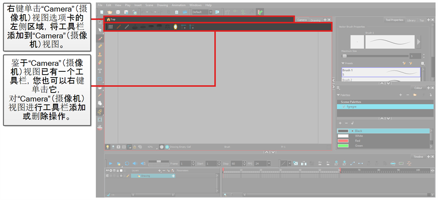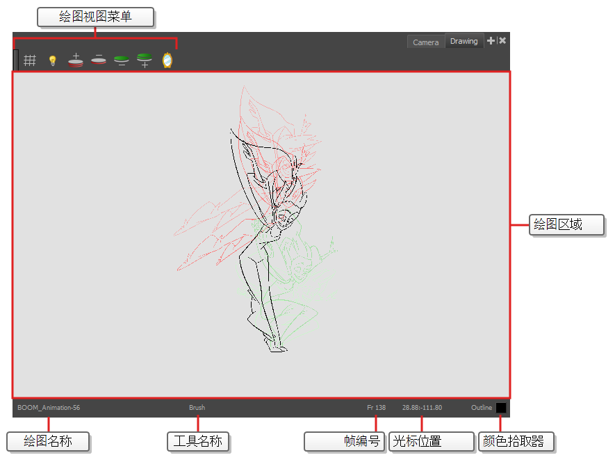 Harmony 中,您可以在“Drawing”(绘图)或“Camera”(摄像机)视图中绘制图案。 虽然两个视图相似,但是在绘图方面有一些差异。