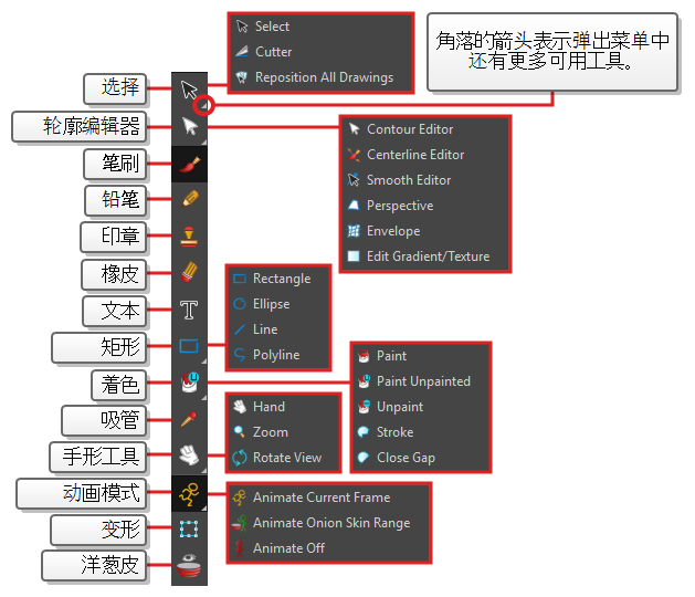 “Tools”(工具)工具栏中,部分按钮的右下角有一个三角形。 表示此按钮堆叠了数种工具。 若要使用这些工具,可以单击或按住工具按钮,或者选择工具,然后再次单击。
