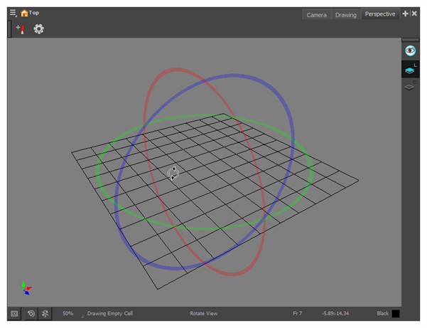 “Perspective”(透视)视图与“Camera”(摄像机)和“Drawing”(绘图)视图出现在工作区的同一部分中。 该视图让可以从任何角度和视角(而不是从摄像机的视角”查看场景。 在此视图中,通常的导航键盘快捷键同样有效,但是还可以按下 Ctrl + Alt (Windows/Linux) 或 ⌘ + Alt (macOS)以任何角度以及在任何轴上旋转视图。