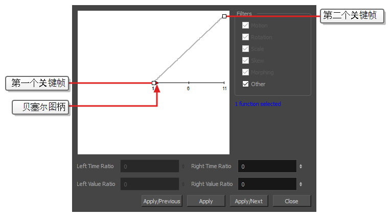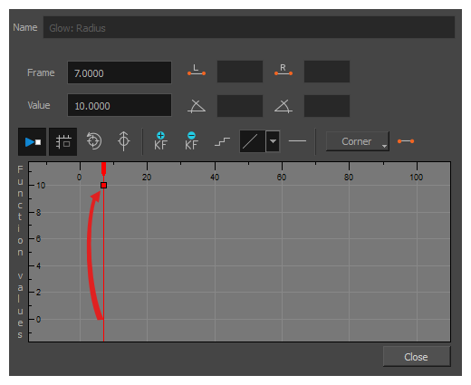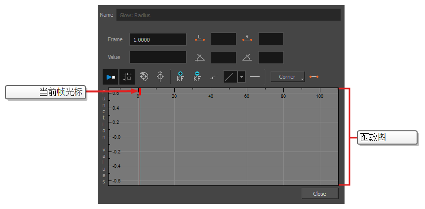 特效中的几乎所有数值参数都可以附加函数。 函数可以添加关键帧,并将每个关键帧设置为特定的值,从而为场景中不同点的不同值设置参数。 在关键帧之间,参数的值将从前一个关键帧的值向下一个关键帧的值过渡。 将绘图层的坐标关联到函数即可实现动画化。 同样,将特效的参数关联到函数也可以实现动画化。