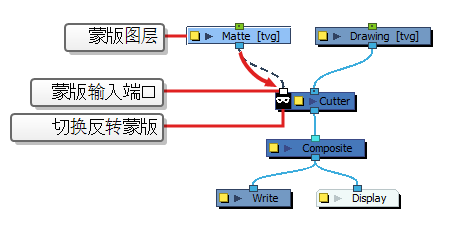 “Cutter”(切割)特效用来切割图像的一部分。 为此,需要将切割工具连接到要切割的绘图以及蒙版图层。 切割工具将利用蒙版图层中绘图的形状,并从绘图层切割出该形状。 如果希望让角色在背景元素之间消失或者如果希望在角色中间切割出一个孔,这会尤其有用。