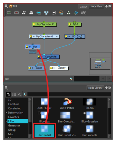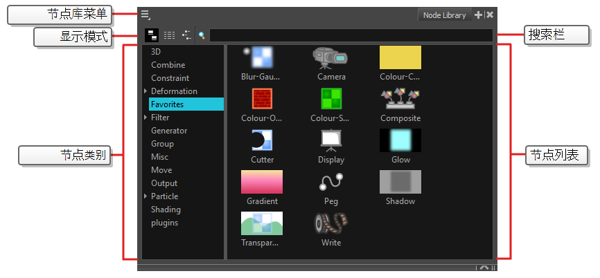 要向“Node”(节点)视图添加特效或其他类型的节点,必须首先在“Node Library”(节点库)视图中找到它们。