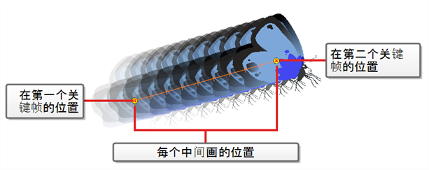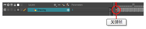 将图层以不同的位置、角度和大小放入场景时间轴上的不同点,即可创建图层动画。 为此,您可以在图层上创建动画关键帧。 关键帧记录图层在特定时间点上的几何变换。 当两个动画关键帧位于场景“Timeline”(时间轴)不同点上的同一图层时,Harmony 会自动在两个关键帧之间的每个帧中补间图层的位置、角度和大小,从而创建动画。