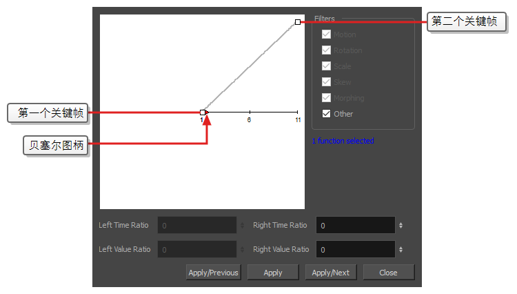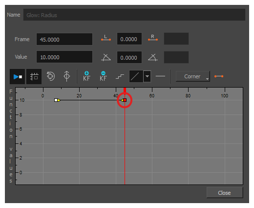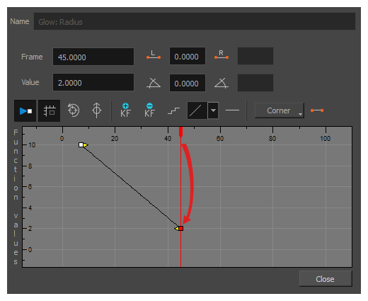 创建成功,并且应在函数图中显示。 如果您没有看见,那是因为函数图的定位没有包含自身帧内的关键帧。 若要移动函数图以查看函数的关键帧,请单击 “Reset View”(重置视图)或