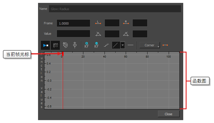 关键帧,向上可以增加其值,向下可以减小。 提示 若要将关键帧设置为函数图帧之外的值,则可以按下 1 键缩小。 您也可以按下 2 键放大。