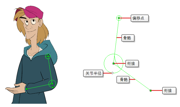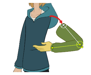 例如,使用“Bone”(骨骼)变形可以使用骨骼连接单一绘图上的手臂,使上臂和前臂可以独立活动,而不必在不同图层上绘制上臂和前臂。 Harmony 将绘图变形,使其看起来有关节。 “Bone”(骨骼)变形的不同部分可以围绕其关节旋转、伸展和缩短,让您具有与在不同图层上为关节生成动画相同的能力,而不必担心部件脱落、轴心点或剪贴轮廓。