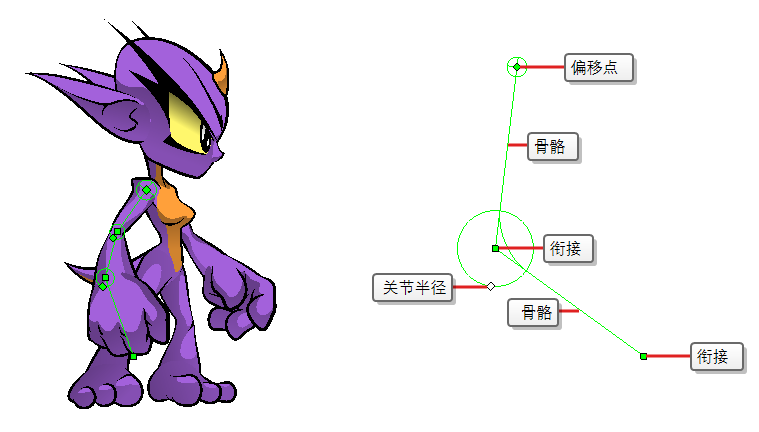游戏骨骼变形与骨骼变形极为相似。 它让您可以创建由表示关节的点组成的结构,以及将这些点连接起来的直线段(表示骨骼)。 游戏骨骼变形的不同之处在于它经过优化,适于导出至 Unity 等游戏引擎。 因此,它通常仅用于最终需要导入 Unity 游戏中的动画角色,而不是用于动画制作。