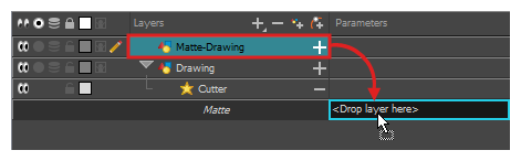 将蒙版图层拖放到“Parameters”(参数)列下方的“Cutter”(切割工具)图层的“Matte”(蒙版)字段旁。
