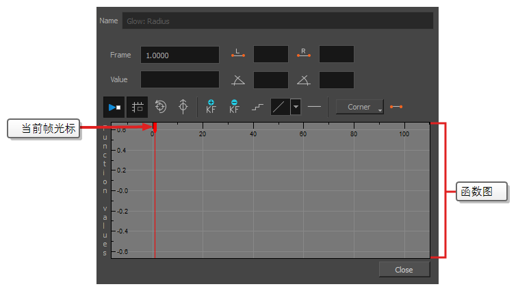 您可以使用这个对话框动画化该函数。 底部的函数图用于显示场景中每个帧的函数值。