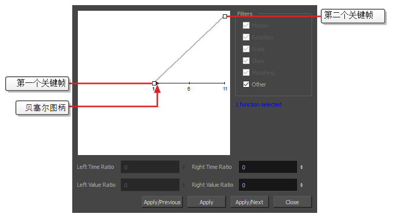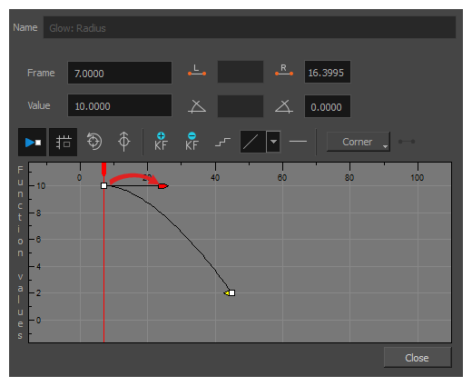 创建成功,并且应在函数图中显示。 如果您没有看见,那是因为函数图的定位没有包含自身帧内的关键帧。 若要移动函数图以查看函数的关键帧,请单击 “Reset View”(重置视图)或