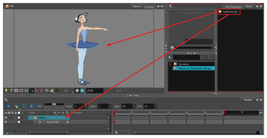 如果模板与场景的一部分的图层结构相同,则可以将模板直接放在“Timeline”(时间轴)视图右侧的帧上。 这将把场景中的绘图和关键帧替换为模板中的对应项,而不是将新图层插入场景。 这可用于为已经处于场景中的角色导入姿势或动画模板。