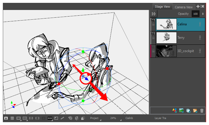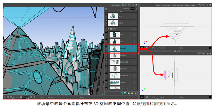 Storyboard Pro 允许在 3D 空间中操作绘图层,以及将 3D 模型集成到故事板。 如果项目使用 3D 模型,可以将它们导入到项目中,然后将其插入分解镜头,而无需绘制。