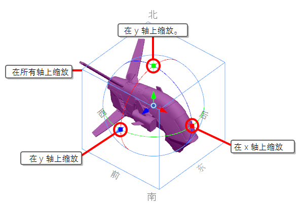 - 若要在 z 轴上缩放模型,请单击并拖动蓝色方点。