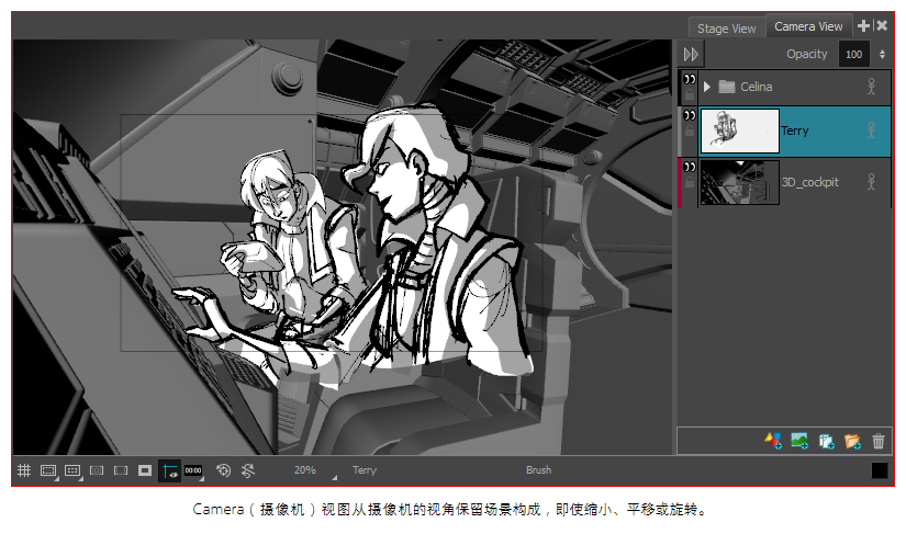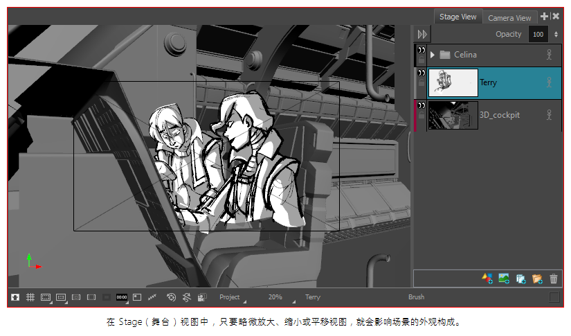在 Storyboard Pro 中,Stage(舞台)视图是绘制和操作对象的默认视图。但在 3D 模式下有个缺点:平移、旋转、放大或缩小舞台视图时,会改变查看舞台的视角。 这意味着元素的外观位置和大小可能无法体现故事板或样片中的真实情况。