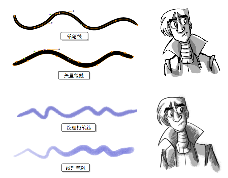 在矢量图层上,可以使用铅笔线、纹理铅笔线、矢量笔刷和纹理矢量笔刷进行绘图。 铅笔线是您可以加粗的矢量中心线,笔触则是填充颜色的纯色矢量形状,而纹理笔触则是填充了位图纹理以过滤其颜色的笔触。