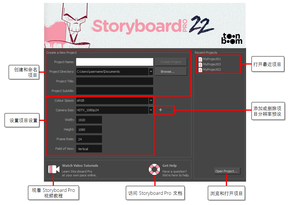 首次打开 Storyboard Pro 时,将显示两个对话框。 第一个对话框包含转到以下内容的链接: